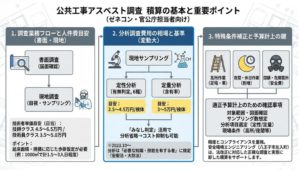 - 強み②:エンジニアリング視点での「みなし判定」 単にサンプルを取るだけでなく、ゼネコン出身の労働安全コンサルタントが監修。設計図書を精査し、過剰な分析コストを抑えつつ、見落としのない「技術屋の調査」を徹底します。